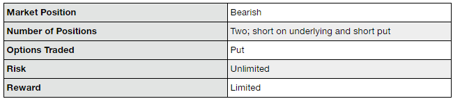 In this case, while holding a short position on the underlying, the trader also writes a put option on the same underlying and earns a profit. The risk, however, is that if the price of the underlying rallies upside, the trader will incur huge losses.