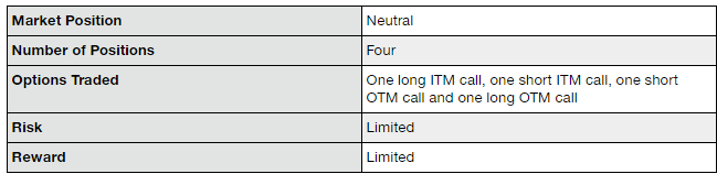 The strategy is constructed by using one long lowest in-the-money call, one short middle in-the-money call, one short middle out-of-the-money call and one long highest strike out-of-the-money call.