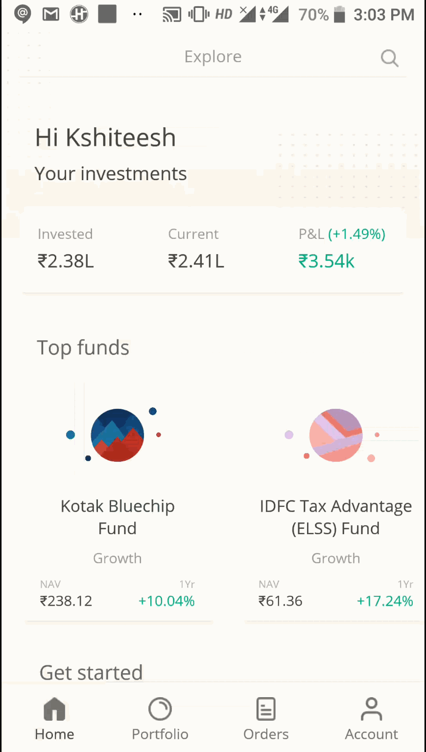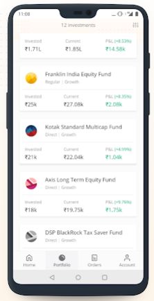 The portfolio screen will list out all the mutual funds you have chosen to invest in along with the current valuation of your investments.
