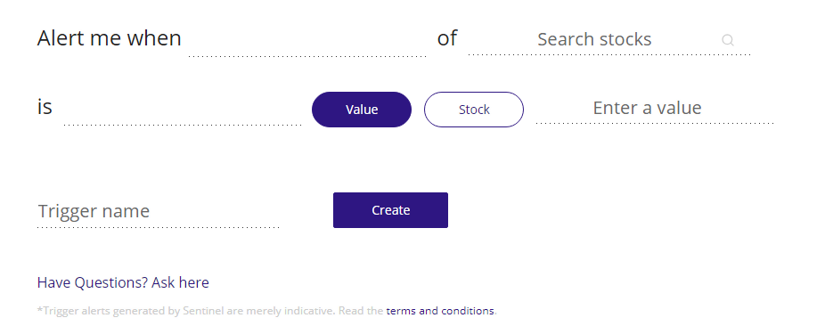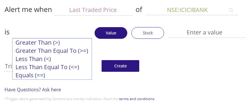 In order to pick either one, you need to select either Value (for Option#1) or Stock (for Option#2). This is one differential feature of Zerodha Sentinel as compared to other generic notification tools.