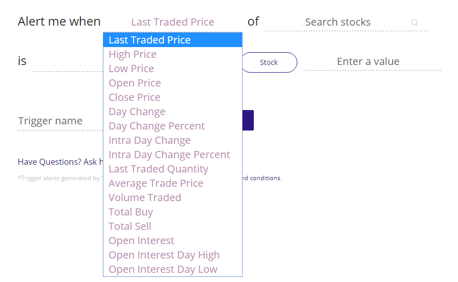 4. Once you have added the Trigger, you will be required to search for the specific stock you are looking to add the trigger for. As per the discount broker, they have a detailed list of 80,000+ stocks that you can choose from.
