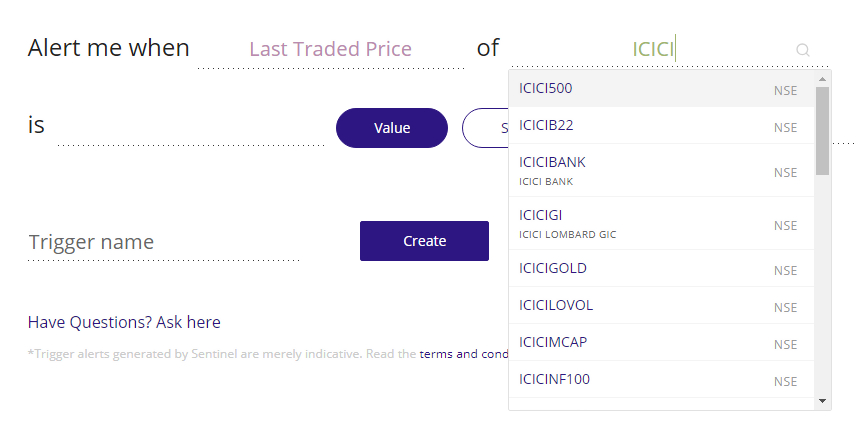 - You can combine multiple alerts in order to create Advanced Alerts. For instance, if you want to specifically observe the closing price and volume of ICICI Bank and see whether the volume traded is higher than HDFC Securities – that can be done using Advanced Triggers.