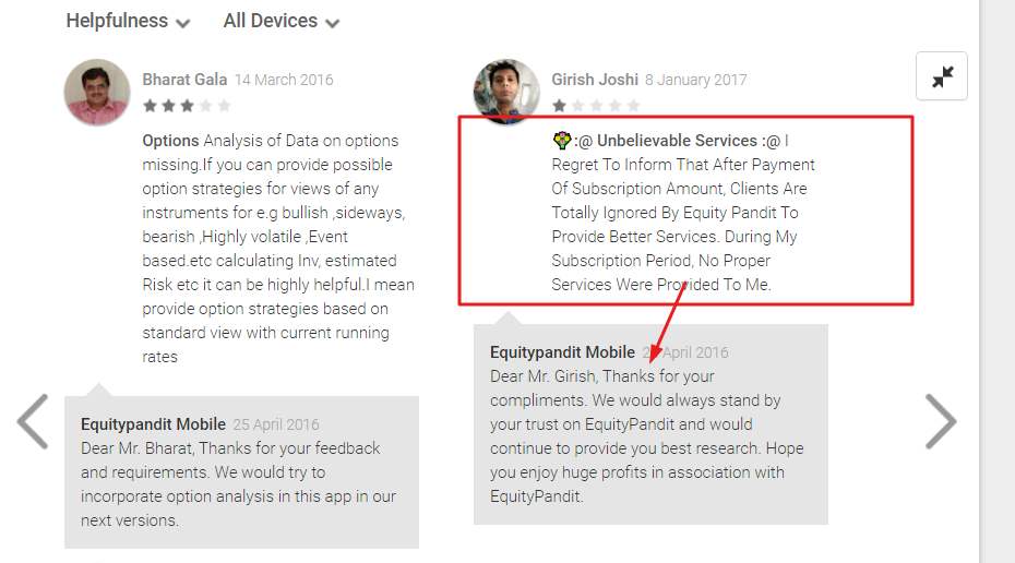 - Customer service is compromised at times. Support staff looks to cross-sell or up-sell the services provided by the advisory firm. Here is a look at the careless response from Google Play store: