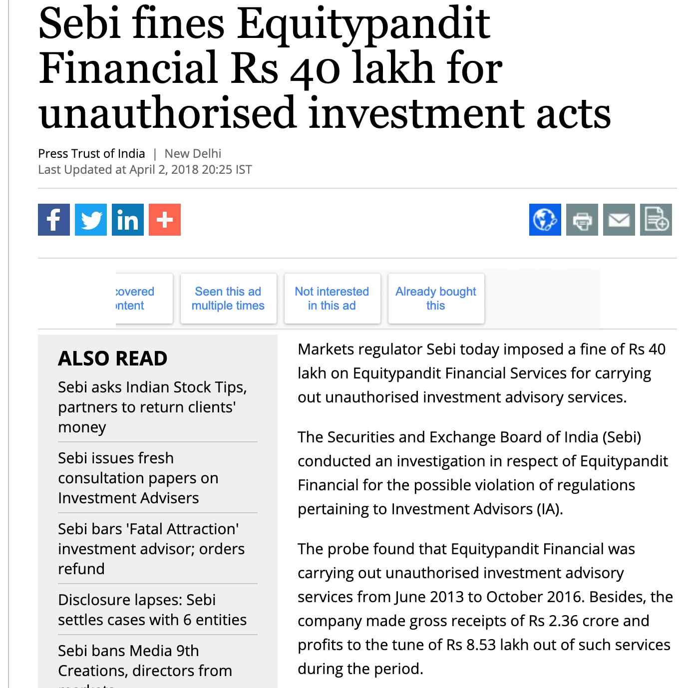 Looking at the overall financials, EquityPandit was imposed with this fine. Here is one screenshot from Business Standard: