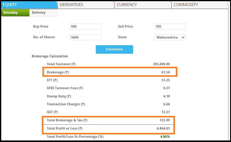 To use it, the trader has to enter the buy value, sell value, and quantity. On the basis of the total turnover value, the brokerage along with net profit/loss will be displayed on the screen.
