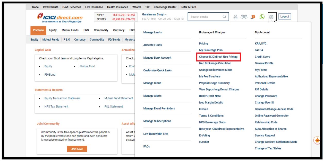 - Go to the ‘Setting’ icon and click on ‘Choose ICICIDirect Neo Pricing’: