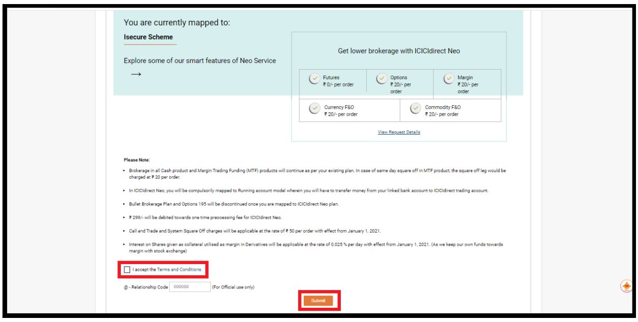 - A new window will appear on the screen. Click on ‘I agree to the terms and conditions and click on submit to register for the ICICI Direct Neo Plan.