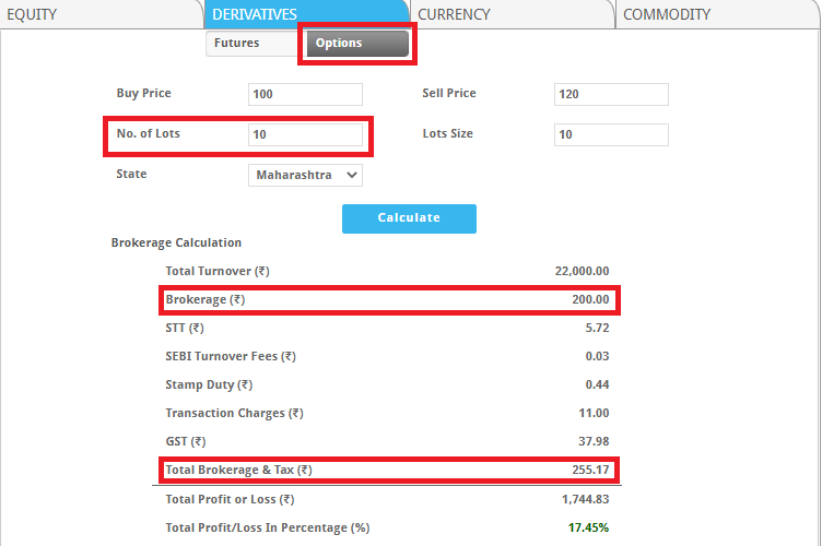 Coming to the next segment, let’s say that you trade in commodity or currency options. Now here, the brokerage is either ₹20 per lot or 0.05% per transaction.