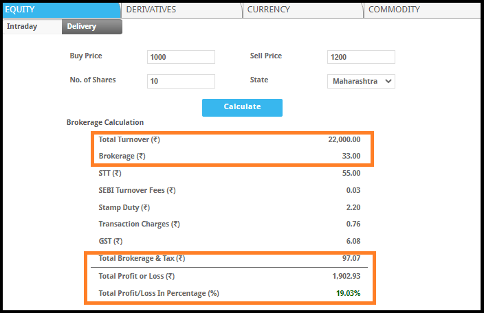 To make it easier to understand these charges you can use the brokerage calculator and find the detail of brokerage, fees, and total profit or loss percentage.