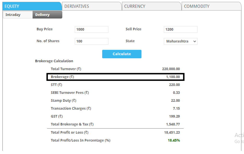 For equity delivery, the broker imposes a charge of 0.5% per order is imposed on the investor. Thus, in that case: