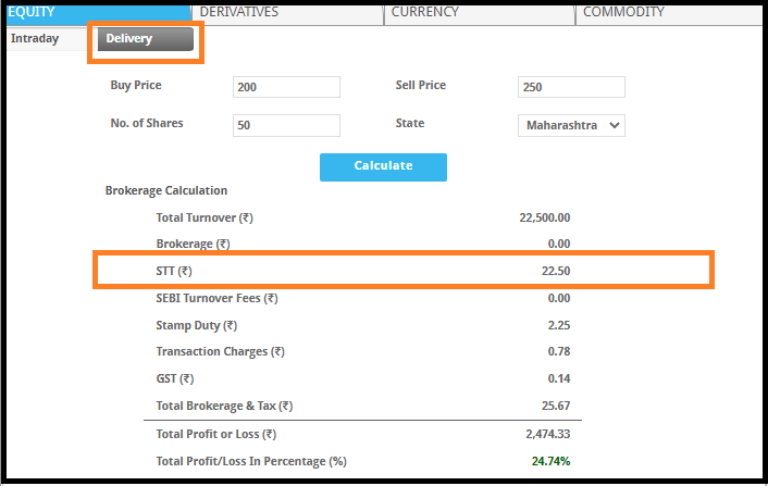 Suppose you have 50 shares of TATA at a price of ₹200 per share and sold those shares for ₹250 after 2 months. Thus, you executed trade in equity delivery segment. So, as per the charges enlisted in the above table, you have to pay 0.1% on your turnover value as STT charges.