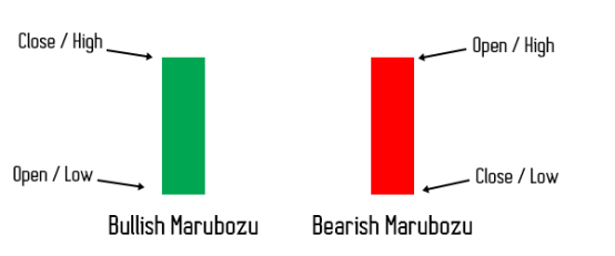 There are no upper and lower shadows in the candlestick charts. The image in the picture posted below shows a bullish marubozu candlestick (and a bearish marubozu candlestick).