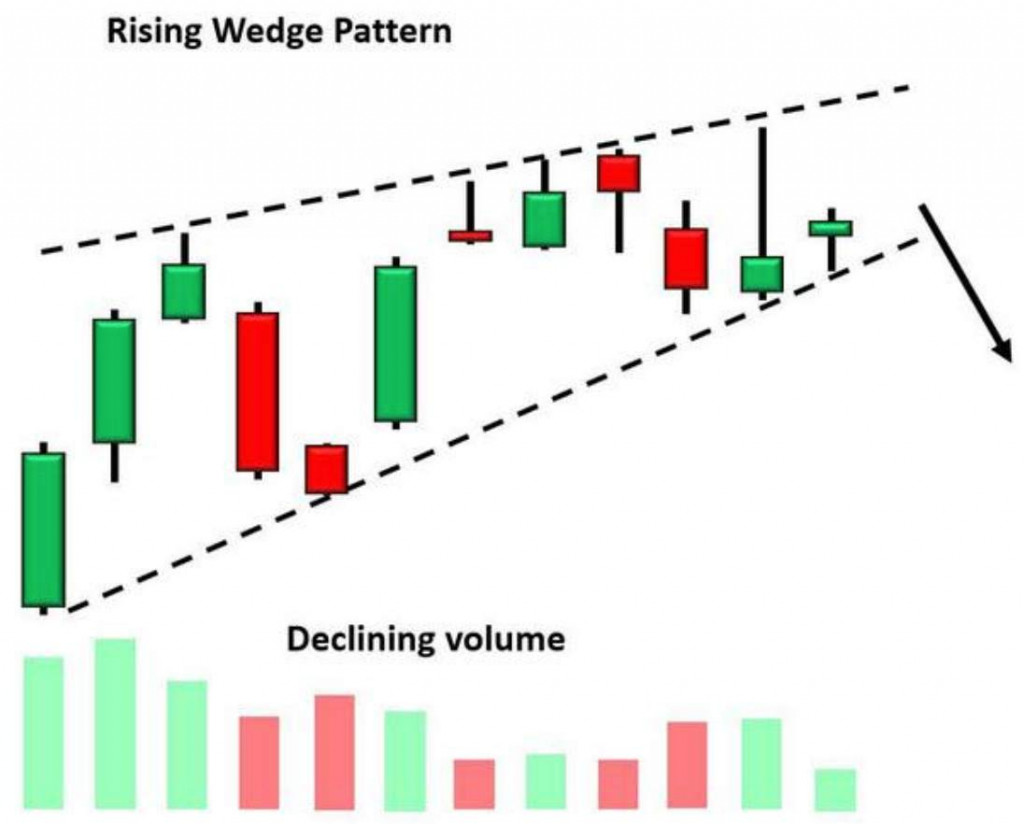 The second one is a decline in volumes traded along the way of the formation of the wedge. And the last one is a breakout happening below the bottom trend line.