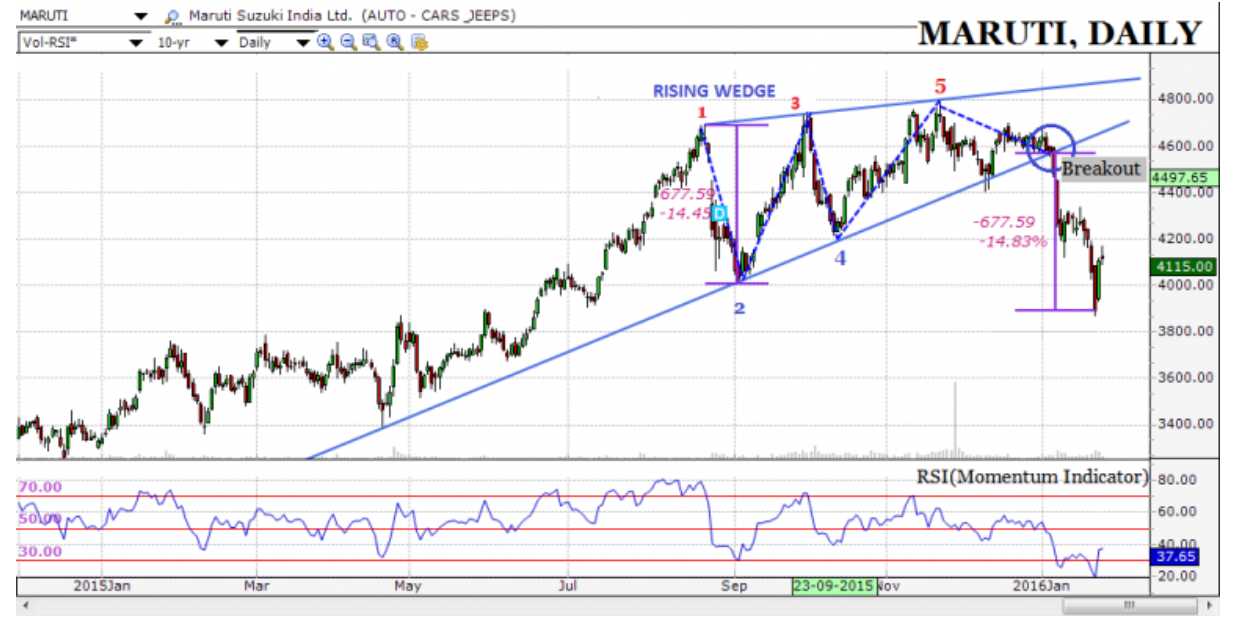 Let us take a real-life example to observe rising wedge pattern and see how a trade taken at the right moment could have earned huge profits for a trader.