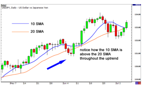 In the above chart of USD/JPY, the 10 simple moving average is above the 20 SMA throughout the uptrend. It shows it is the right time, where you can open your position and can buy a currency pair.