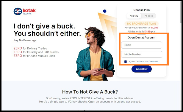 - A new page will open up. Accordingly, choose your age there. If you are below 30 years of age, go for the No brokerage plan, or else, go with the Kotak Trade Free plan.