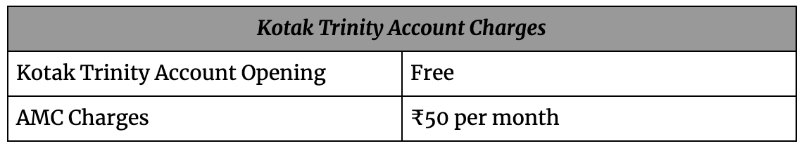 Kotak also charges some amount on its trinity account, like account opening charges and also Kotak account maintenance charges. Let us now have a look at the charges.