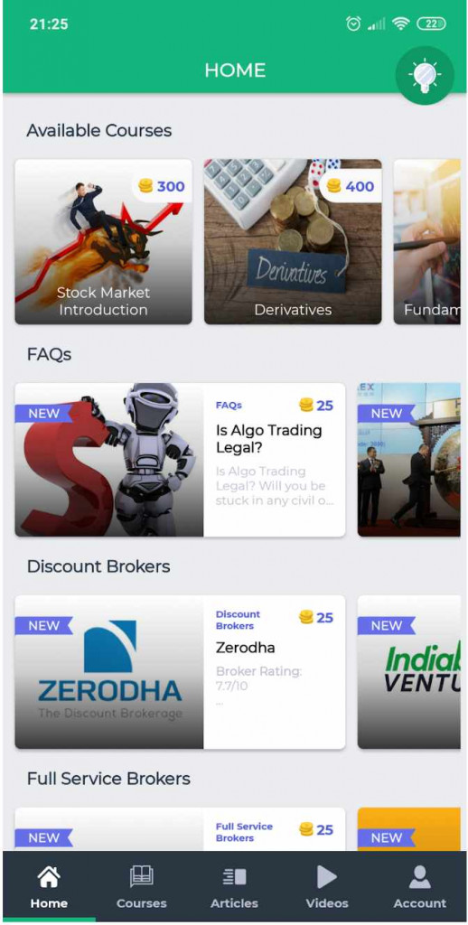 After completing every course, reading articles and watching videos, one earns some coins which can be later redeemed for some amazing offers from one of the best stockbrokers, advisories and algo trading companies.