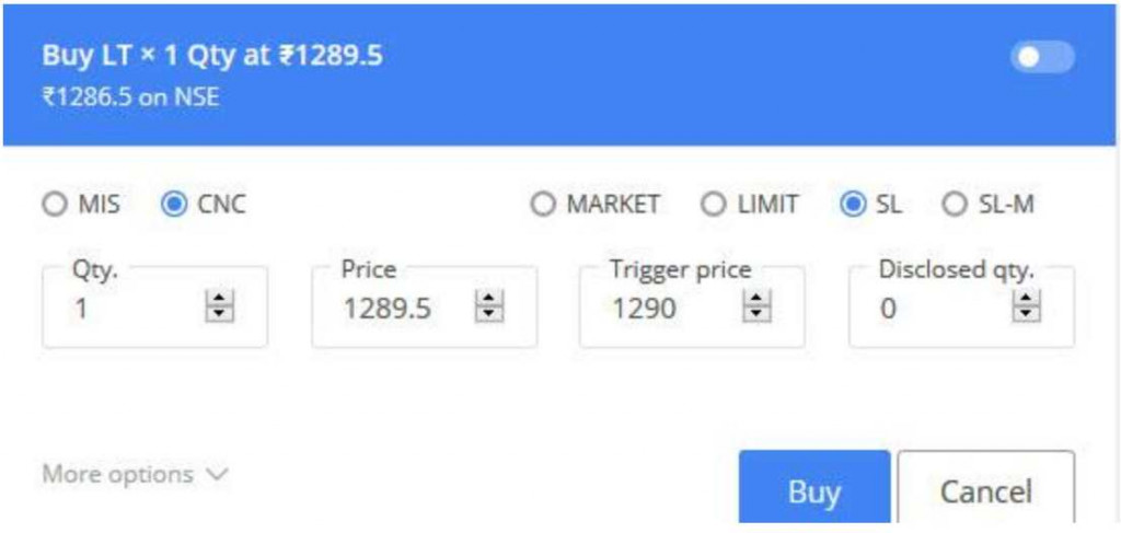The trigger price should be a little lower than the price at which one wants to initiate a buy order. As soon as the trigger price of ₹1290 is reached, an order for buying 1 share of L&T at ₹1289.5 is placed.