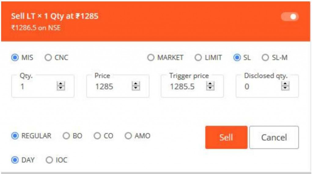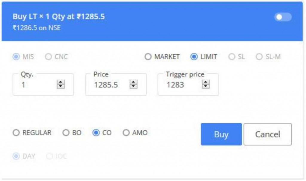 Suppose I want to buy 1 L&T share through cover order, I will be required to fill quantity, the price at which I want to enter and a trigger price which is acting as a stop loss.