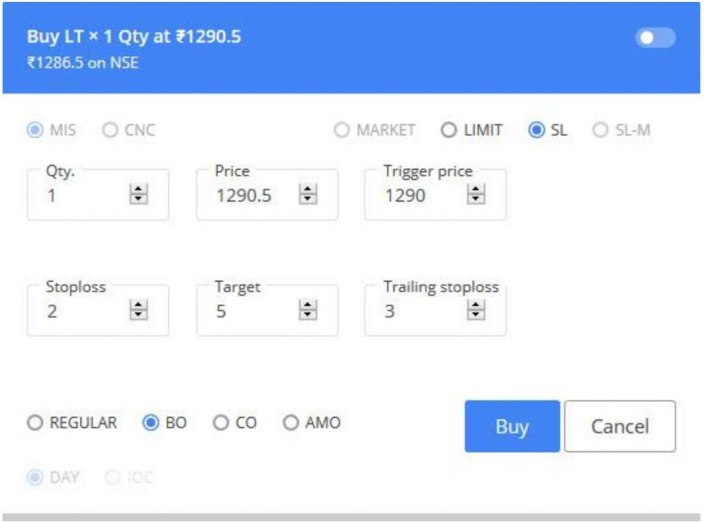 In this type of order, one needs to fill in details like the price at which the order needs to be executed, target, stop loss and trigger price which is above the current market price and a little below or equal to the price at which buying of shares is desired.
