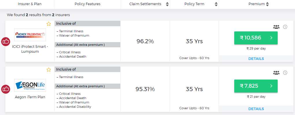 Based on the details are have provided, 5Paisa Insurance provides you with a list of different Insurance schemes its partner companies can offer you. It looks like this: