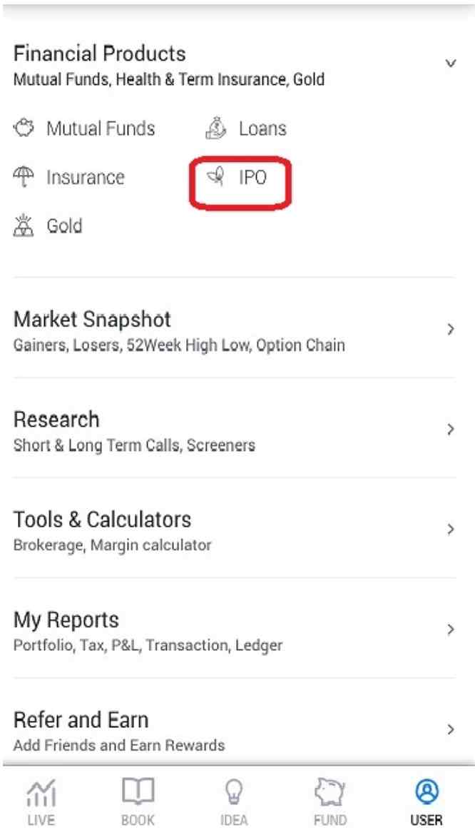 4. In this option, you can find different products such as Mutual Funds, loans, insurance, gold, and IPO. Now, tap on the IPO segment.