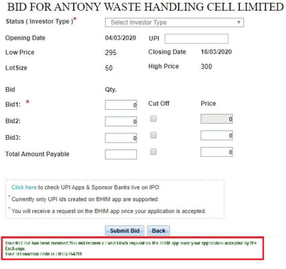 Your bid will be successfully submitted to the bank and within a few minutes, you will receive a confirmation message from the bank.