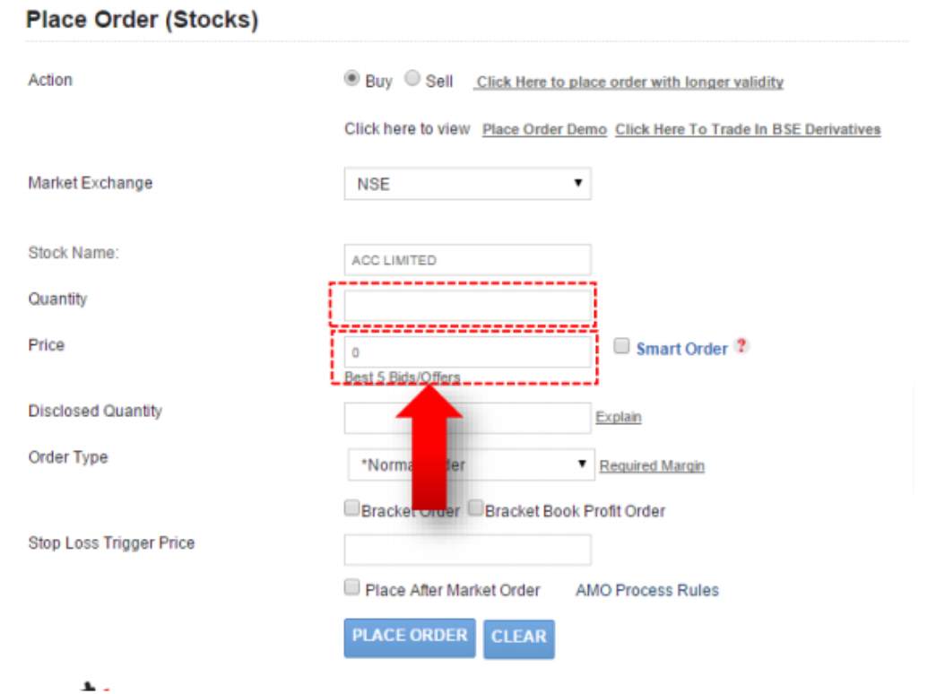 - Now on the ‘Place Order’ menu click on stocks or derivatives options.