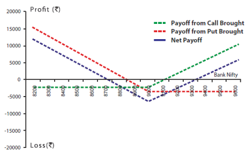 In this case, the trader buys a call option at 9000 and a put option at 9000, with the same expiry. The premium to be paid for the call option is ₹100 and for the put option is ₹200.