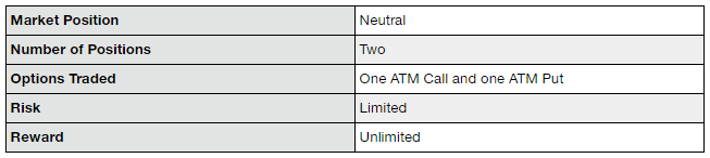 This options trading strategy has the potential to give unlimited rewards, with limited risks. The trader is able to trade based on his conviction that the markets will move, without being concerned about the direction of the movement.