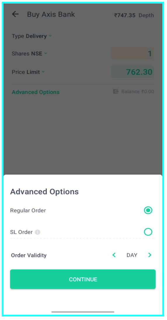 - You can then enter your price and as you can see in the image below, you may even click on advance order, under which you see various options that you may use as per your trading goal and needs.