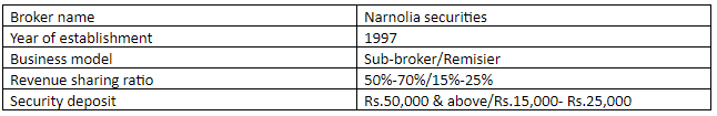 Narnolia also has some of the criteria for the security deposit which a franchise is required to deposit with them. The security deposit is taken to adjust the default if made by the sub-broker or remisier.