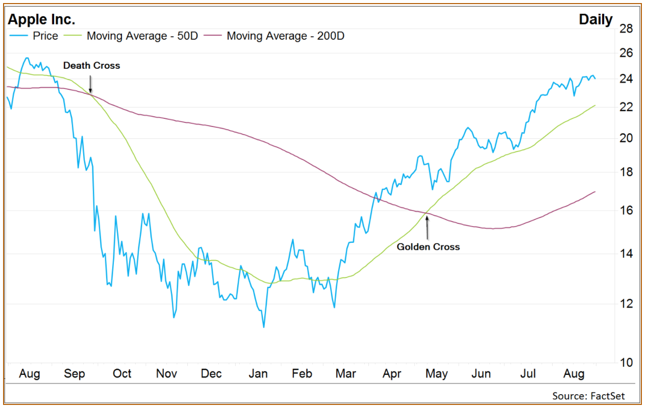 So when the fast-moving average crosses the slow MA line from below, “Golden Cross” is indicated showing a bullish trend while when the crossover happens from above, it is called “Death cross”, thus showing the bearish trend.