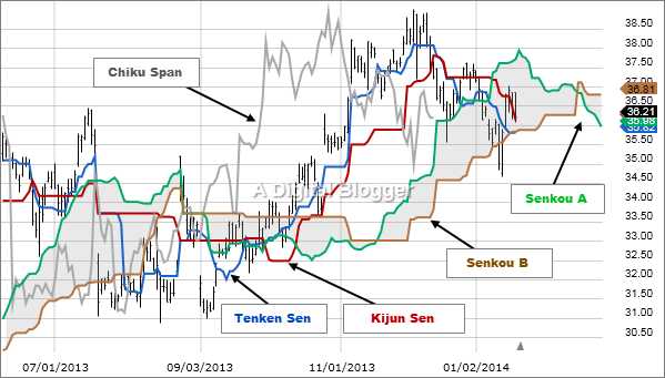 - Blue line (Kijun Sen) – It is another moving average function that is similar to the Tenkan Sen (red line), but it uses 26 days average instead of 9 days. The Kijun Sen moves much slower than Tenkan Sen because it uses more days (periods). The reaction display will be less since it uses more periods than short periods.