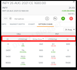 • Inbuilt option chain- It shows you the call option on the left and put option on the right with the strike price in the center. The last traded price, open interest, and bid price are also prevalent.