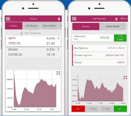 - Then comes, THE most important aspect of a mobile trading app – Order placement feature. You can do so by pressing the mic button and speaking out the exact stock/scrip along with the price and quantity. For instance, if you want to buy 100 stocks of SBI at ₹1200, then you need to speak out “Buy SBI 100 Quantity at ₹1200″.
