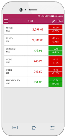 - Once you login to the application, you are provided with the following features including access to domestic and international markets, segments such as Equity, commodity, currency along with the market watch, charting etc.
