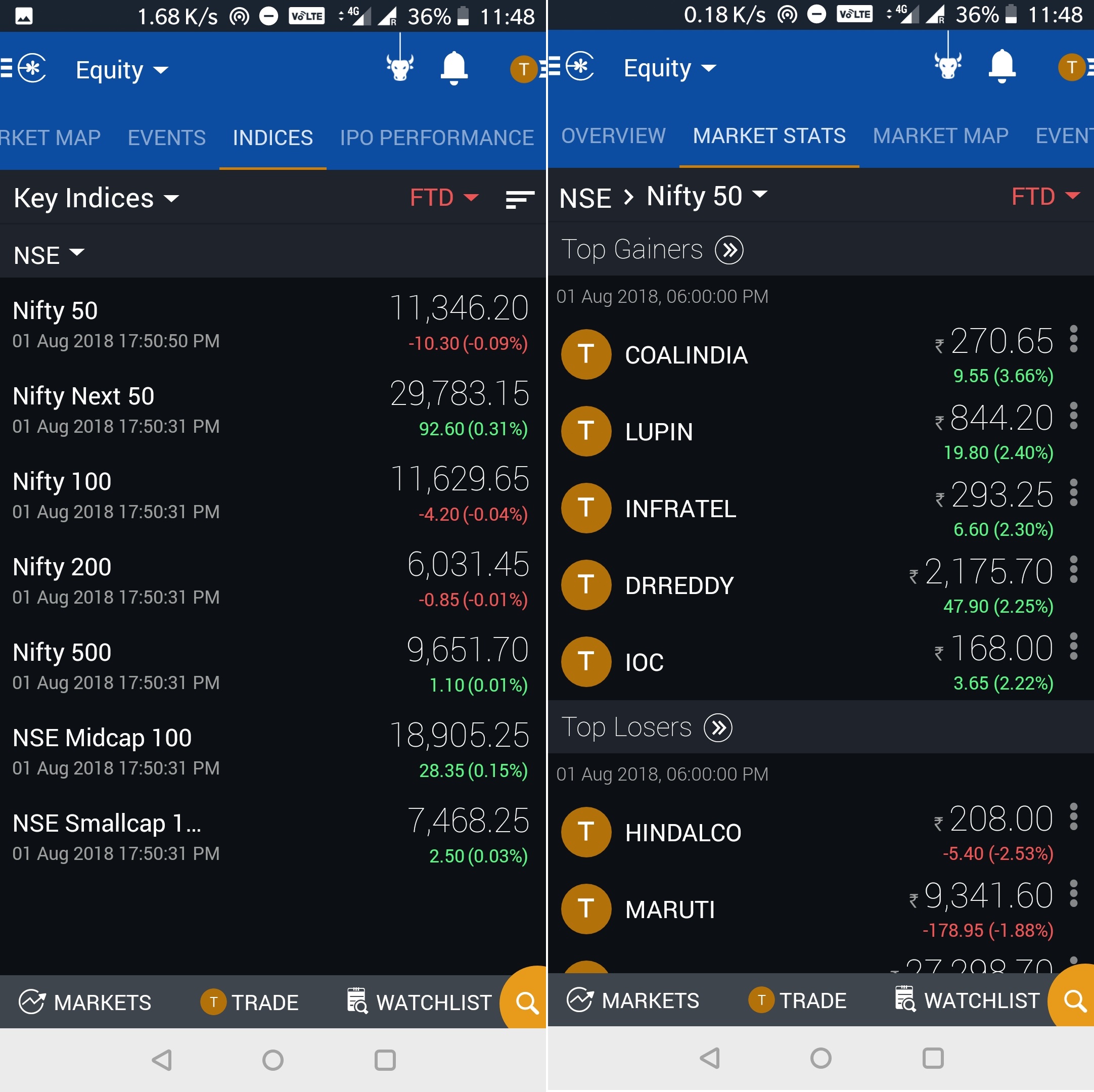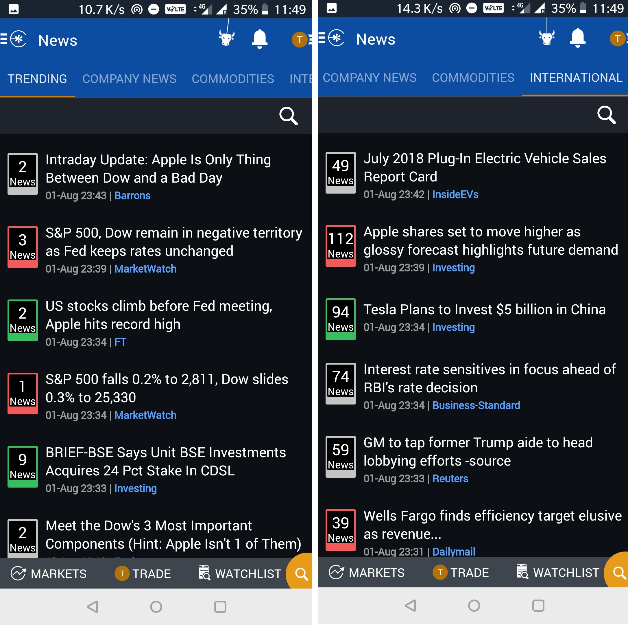 - Apart from the research, it makes total sense to stay aware of the market news at domestic & international levels, at segment be it the commodity, currency, equity etc levels and so on. The app displays all sorts of news from different feeds and it’s your job to break-down this news into useful bits of information before placing your trade in the stock market.