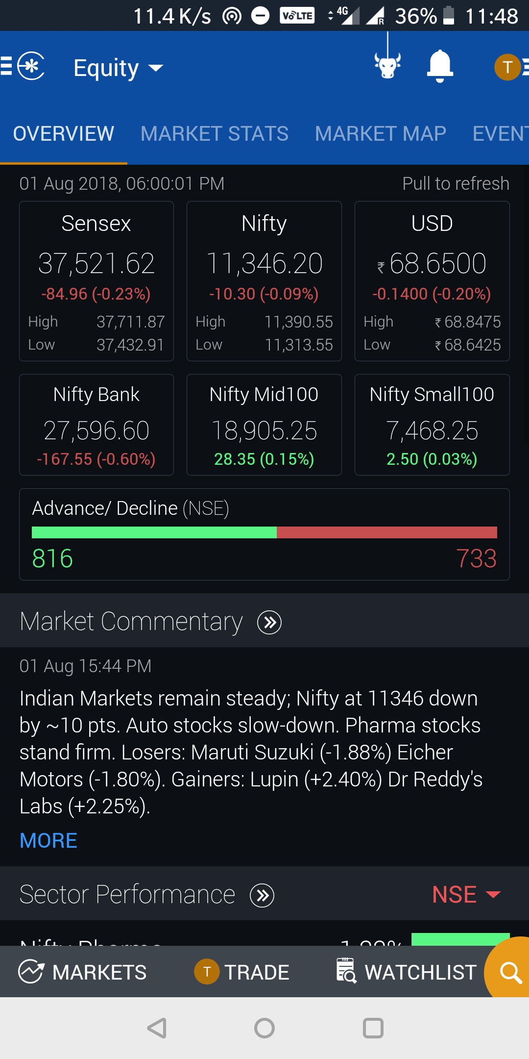 - In case you are looking to invest in the Equity segment, the below-mentioned screen displays the market overview. Here you can check top market indices along with real-time market commentary and generic sector performance at that particular point in time.