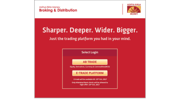 For the users that do not have an account with the Allahabad Bank, the company provides AB trade platform parallelly with Etrade Aditya Birla. As per the company, both platforms offer similar features only their look and feel is a bit different.