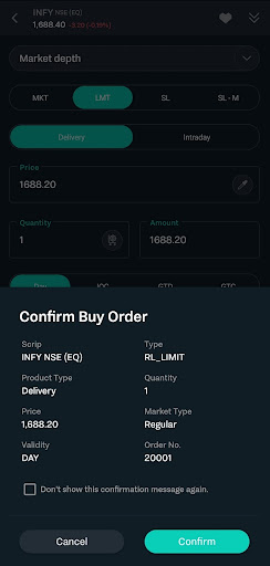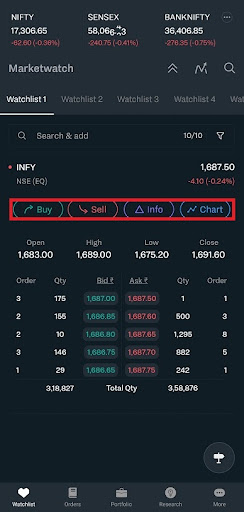 - Easy Actions- You can view real-time market updates and watch the scrips closely. Not only this, but you can take your trading action directly by clicking on the scrip. When you click on the scrip, you will see the buying, selling, charts, info. Not only this, but it will also show you open, high, low, and close data, all on a single screen.