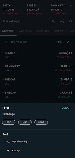 - Watchlists- You can easily add scrips to the watchlists, filter them, and look for the info and charts by directly clicking on the scrip.