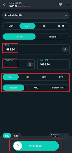 - Now select the order type, quantity and click on buy/sell.