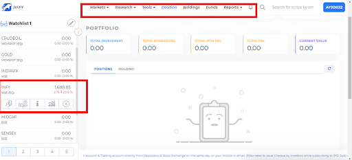 Other than this, you can also buy and sell from the charts and also by searching the scrip in the search bar.
