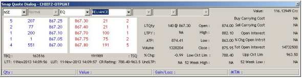- With the Snap Quote feature, the user can check out the current situation of a particular scrip. This can be done by just pressing F6, with which a small pop up window is displayed to the user with details on the scrip such as Open, High/Low price, top 5 bid/ask and more as shown below: