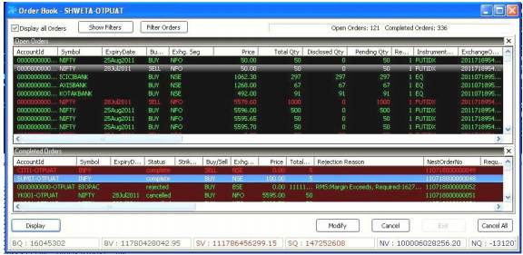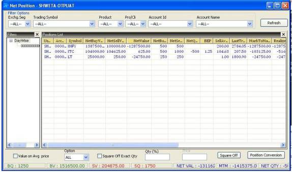 - Using the combination of “Alt” key with “F6”, the user can invoke the “Net Positions” window, which gives a complete snapshot of the user’s market position across indices and exchanges.