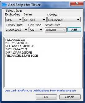 - With the “Ticker” feature, the user can add specific scrips and whenever there is any trade in the added scrips, the trade details (trade price and quantity) are displayed on top of the terminal in the ticker space.