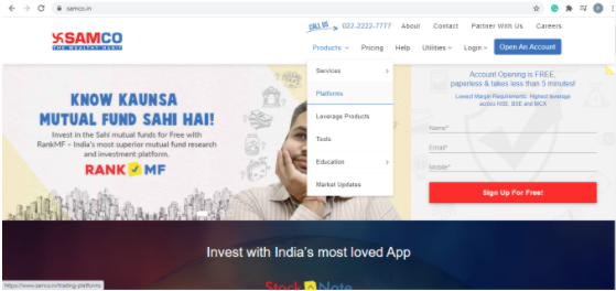 The login process for all these are quite similar. Simply navigate to Samco’s official website and click on the “Products” tab.