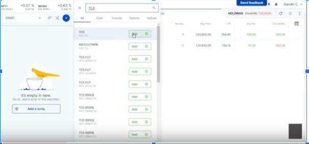 - Create a watchlist in which you can view your preferred stocks. Just click on the “+” button and add a scrip of your choice in the watchlist.